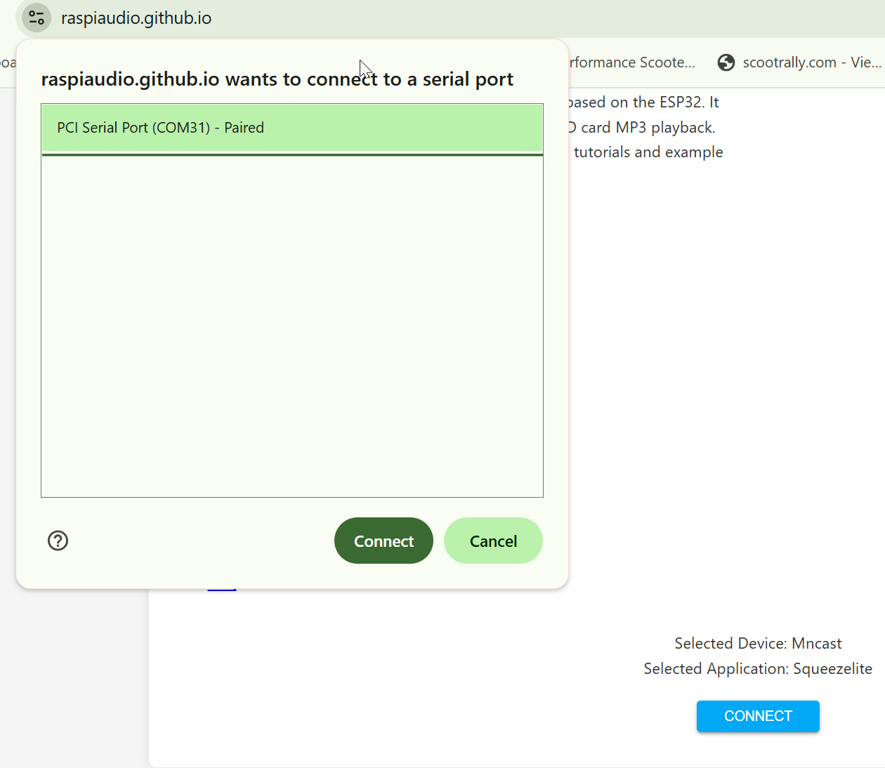 Then in chrome apps.raspiaudio.com Mn CAst - Squeezelite click on Connect